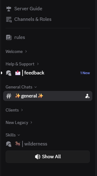 I looked to see if I had hidden some channels, I did not. In my skills list there is only "wilderness", none of the other as you have shown in your picture. I only see wilderness because you had it linked before you edited out the three links and added the picture.